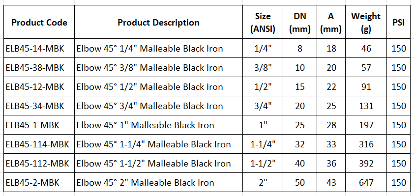 Elbow 45 – Malleable Black Iron In a Black Iron Pipe Elbow Piping System, the elbow is a pipe fitting that changes the direction of the pipeline at a 45-degree bend. SpecificationClick on the image to download: Elbow 45